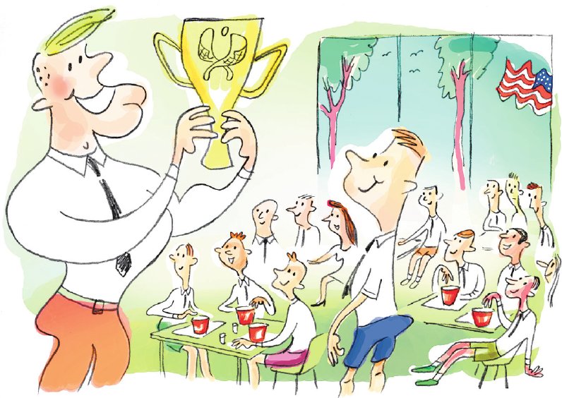 Na het eten was het tijd voor het belangrijkste onderdeel: de jaarlijkse prijzen. Het leek wel een Oscaruitreiking, met prijzen in de meest uiteenlopende categorieën. Voor de beste speler natuurlijk, die het winnende punt had gescoord, maar ook voor degene met het meeste strategisch inzicht. Het was stil in de zaal. Niemand die erdoorheen kletste. Groot applaus volgde bij de uitreiking van de prijs voor het beste teamlid. De zongebruinde plastisch chirurg naast me – die speciaal voor deze avond was weggevlogen van zijn jacht – zag de begeerde prijs aan de neus van zijn zoon voorbij gaan. „Dit is de belangrijkste categorie”, had hij me tijdens het eten verzekerd. „Naar deze winnaars zoeken we als we een nieuwe collega nodig hebben.”