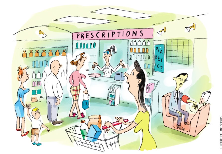 “Maar vorige keer kreeg ik het zonder problemen”, zegt de dame voor mij in de rij bij de apotheek zacht. De apotheek bevindt zich in een hoekje van Wegmans, een gigantische supermarkt, ergens tussen de groente en de vleeswaren. Naast ons staan zeker zes schappen met benodigdheden voor diabetespatiënten. Ik schat dat er zo’n veertig verschillende soorten en maten bloedglucosemeters te vinden zijn. Het meisje achter de balie, met helblauwe mascara en een hoge paardenstaart, staart haar aan zonder ook maar één keer te knipperen.