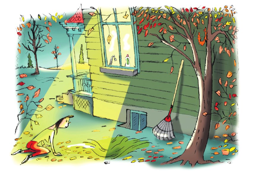 Buiten in de tuin rakel ik wat bladeren op met mijn blote handen en ruik de zoetzure geur van de herfst. Ik ben op zoek naar de stomp. Omdat we erover bleven struikelen, hebben we geprobeerd hem zo goed en zo kwaad als mogelijk weg te halen.