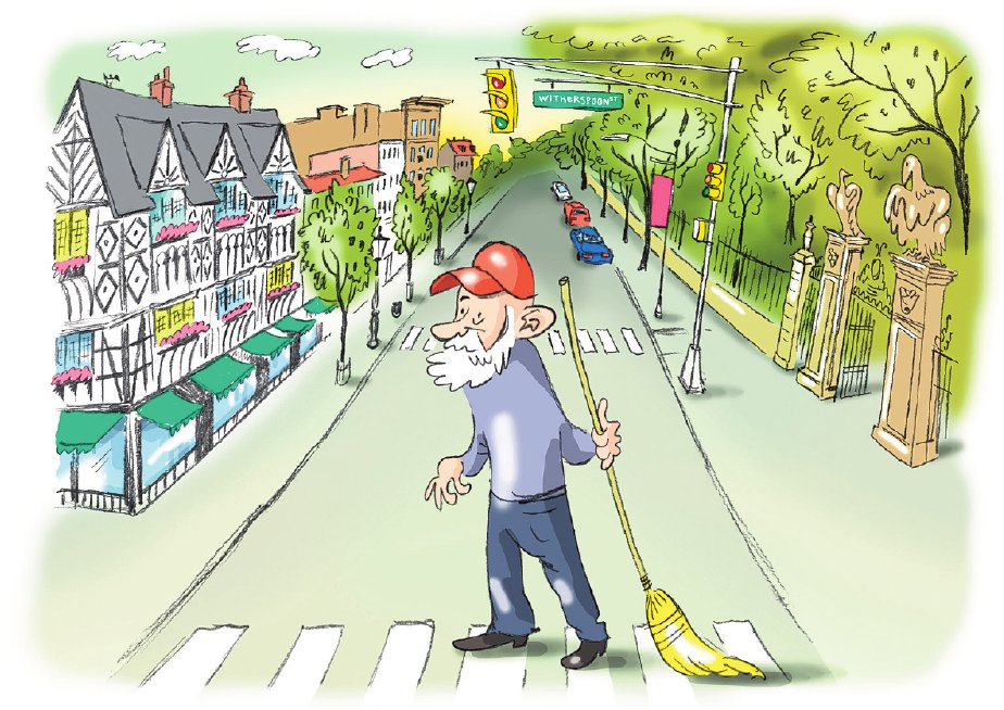 Het duurde dan ook niet lang voor ik in Princeton Bill zag. Grijze baard, pet, en in zijn hand een bezem. Midden op Nassau Street, dat met zijn brede trottoirs Princeton doorklieft. Aan de ene kant is er de universiteit, met haar statige gebouwen en ambitieuze studenten met hun grootse plannen voor de toekomst. Aan de andere kant vind je restaurants, banken, en winkels. Town and gown, zeggen ze hier. Een wereld van verschil, hoewel ze niet zonder elkaar kunnen.