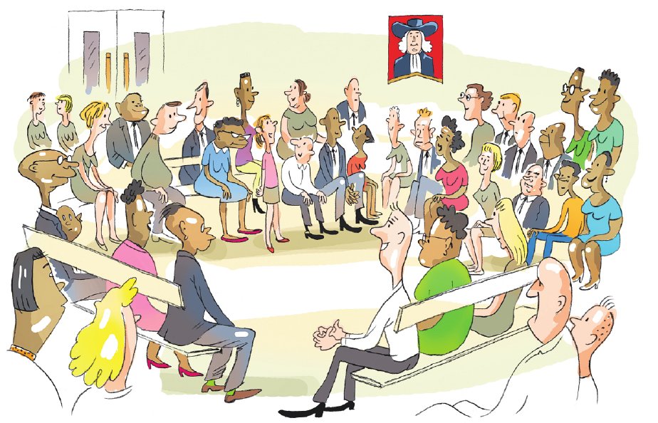 Nu staat een rijzige man in pak op. „Ik ben zo ontzettend blij met deze school.” Er wordt geklapt. De sfeer verandert. Iedereen wil iets delen. Een vrouw met een paarse hoed vertelt dat ze nu, op dit moment, God ervaart. Een zwarte man staat op, met een jongetje dat zich verschuilt in de plooien van zijn jas. „Mijn kleinzoon is te verlegen om te praten”, zegt hij, „maar wil laten weten dat hij blij is dat hij hier naar school mag gaan.” Een golf van amens verspreidt zich door de ruimte.
