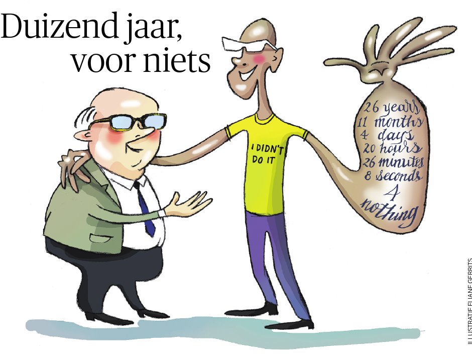 Ik raak aan de praat met Mark Schand. Een zachtaardige man die zevenentwintig jaar geleden op het verkeerde tijdstip op de verkeerde plek was. Zijn vriendin Mia was toen in verwachting van hun kind. Ze bleef geloven in zijn onschuld. Jaar in jaar uit reed ze elke week vijf uur heen en weer vijf uur terug om hem één uur te mogen zien. Afgelopen december vierden ze voor het eerst thuis Kerst met hun gezin. Als hij naar zijn cola reikt, valt mijn oog op zijn arm. Daarop staat in grote letters getatoeëerd: 26 years, 11 months, 4 days, 20 hours, 26 minutes, 8 seconds, 4 nothing.